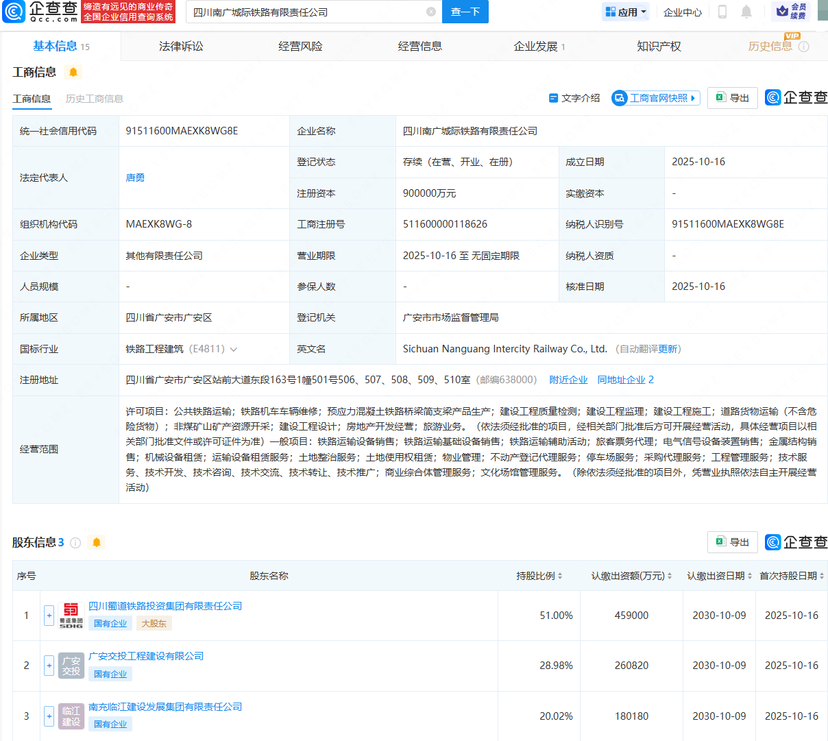 近日,四川南广城际铁路有限责任公司成立,法定代表人为唐勇,注册资本为90亿元,经营范围包含:公共铁路运输;铁路机车车辆维修;铁路运输设备销售;铁路运输基础设备销售等。企查查股权穿透显示,该公司由四川蜀道铁路投资集团有限责任公司、广安交投工程建设有限公司、南充临江建设发展集团有限责任公司共同持股。